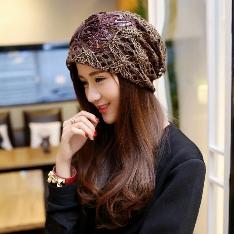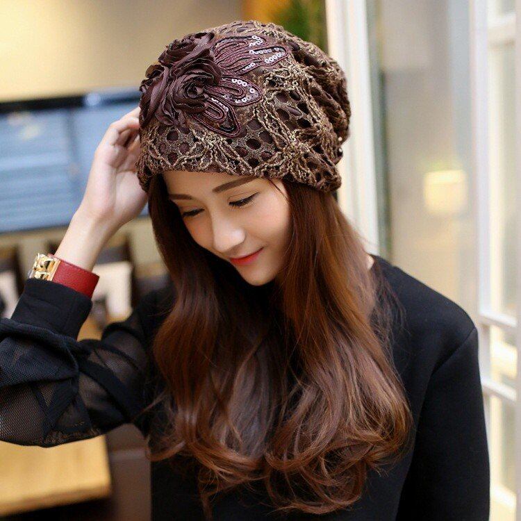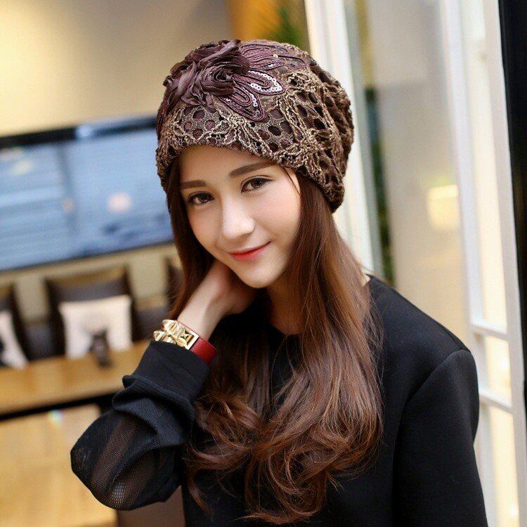 フラワーデザインが可愛くて薄手でとっても軽くかぶれるレディースニット帽です♪